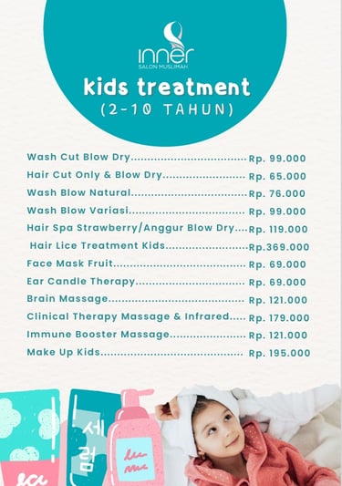 Dengan kidz treatment di Inner Salon Muslimah, kami memastikan setiap layanan menggunakan produk yang aman, bebas dari bahan kimia berbahaya, serta ramah bagi kulit anak-anak. Kami juga menciptakan suasana perawatan yang nyaman dan menyenangkan, sehingga si kecil bisa menikmati pengalaman merawat diri dengan penuh kegembiraan.